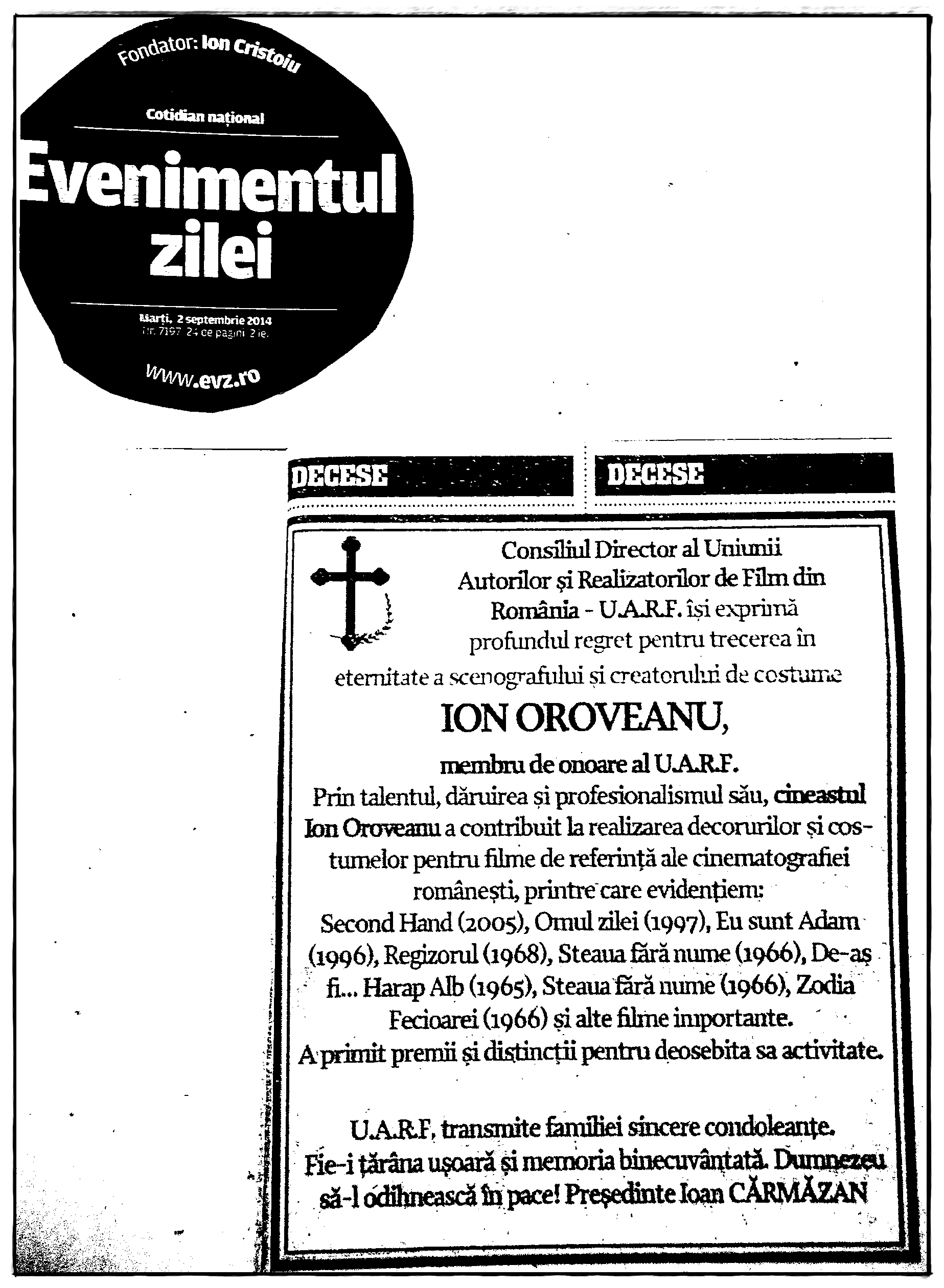 30. — Scenograful și creatorul de costume Ion Oroveanu. S-a născut la 16 aprilie 1927, în localitatea Deva. În a doua jumătate a anilor ’60, s-a stabilit în străinătate. Din filmografia sa, ca scenograf, cele mai reprezentative sunt: „Anotimpuri”, în colaborare cu Zoltan Szabo (1963, r. Savel Stiopul), „Steaua fără nume”, scenografie și costume (1966, r. Henri Colpi), „Zodia Fecioarei” (1966, r. Manole Marcus). „De-aș fi Harap-Alb”, scenografie și costume (1965, r. Ion Popescu-Gopo), distins cu premiul Mamaia în anul 1965. După Revoluție, a colaborat cu regizorul Dan Pizza, ca director de imagine la filmele: ‘Eu sunt Adam’ (1996), ‘Omul zilei’ (1997) și „Second Hand” (2005). A primit Premiul pentru scenografie la Festivalul Național al Filmului de la Mamaia (1965) și Premiul pentru scenografie al Uniunii Cineaștilor din România (UCIN) (1996-1997) pentru decorurile filmului „Eu sunt Adam”.